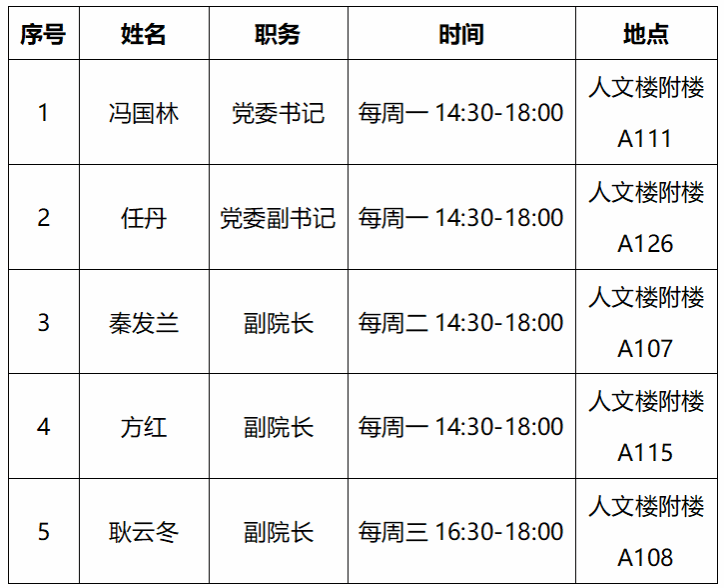 为进一步加强学院领导班子与师生之间的沟通与交流,广泛听取师生员工对学院工作的意见和建议,切实解决实际问题,提高学院管理和服务水平,现将本学期领导班子“Office Hour”具体安排予以公布。全校师生可以在相应时间内前往相应地点与班子成员就日常管理、教学运行、个人发展等议题交流研讨。