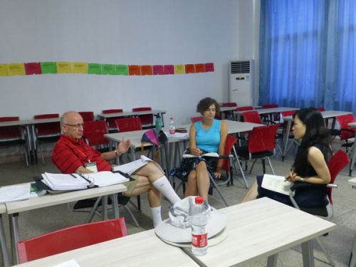 7月12日中午,新葡萄8883国际官网杜蕾等10名教师与David Nickel,Sarah Selz 等20名美籍教师,在四教开展集体备课,备战“暑期国际英语口语强化班”。